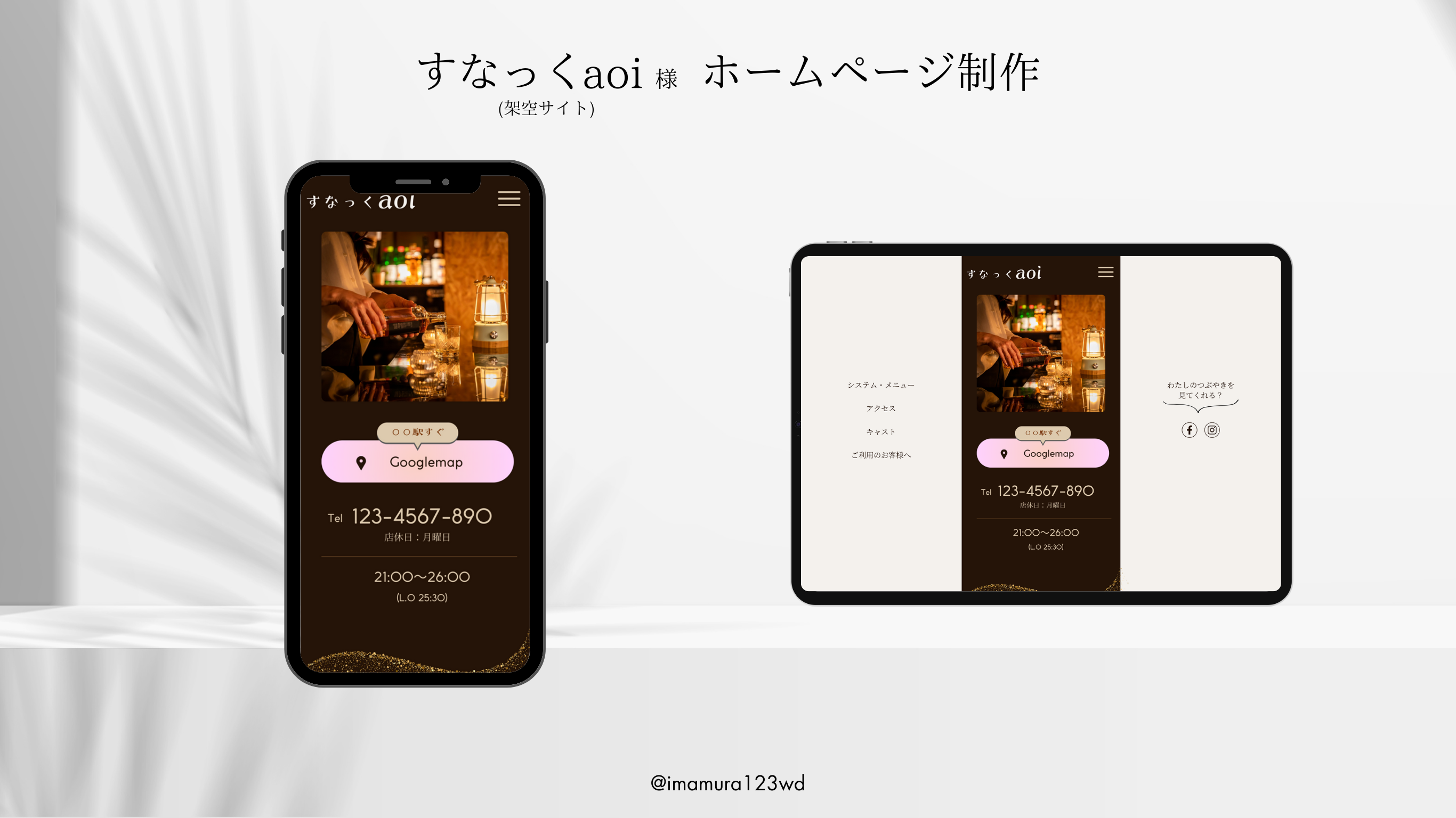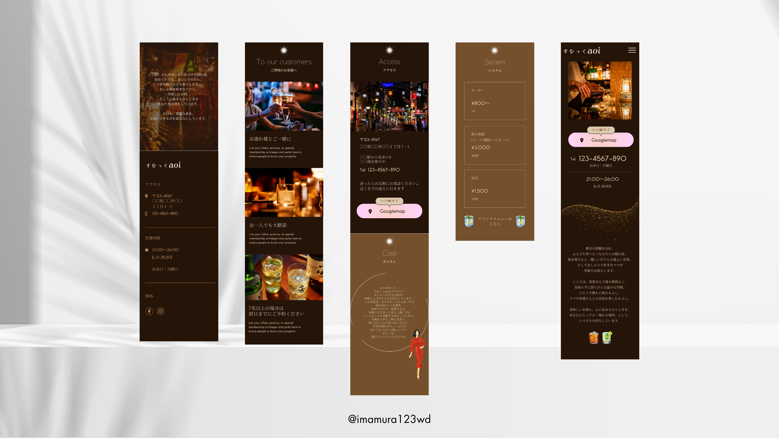 隠れ家のような落ち着いた雰囲気のバーのLPです。 背景画像の照明とシンプルなデザインで、居心地の良さを感じられる空間を表現。 ダークトーンの背景に、ママがお酒を作っている様子を配置することで、温かみのある親しみやすさを演出しています。 メニューや写真は見やすいレイアウトにしました。